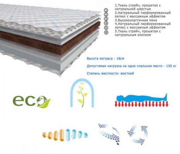 Состав: - Чехол из ткани с натуральными активными пробиотиками Purotex® - Натуральный перфорированный латекс с массажным эффектом - Внутренняя система вентиляции Beeform® - Кокосовая койра - Внутренняя система вентиляции Beeform® - Инновационный материал Memory Foam - Чехол из ткани с натуральными активными пробиотиками Purotex®