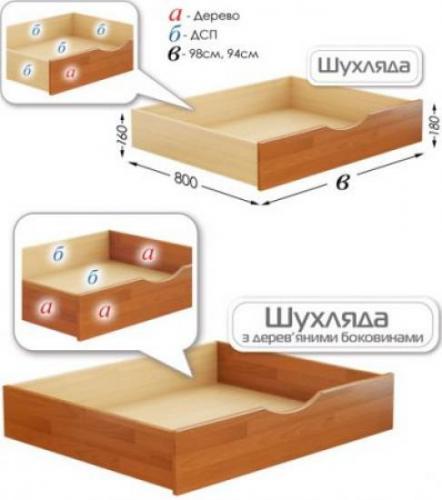 За дополнительную плату к кровати «Нота » можно приобрести выдвижные ящики для белья, лицевая часть которых изготовлена из дерева, а внутренняя - из ДСП (Цена 530грн). По желанию, обе части могут быть выполнены из натурального дерев(830грн ящик)