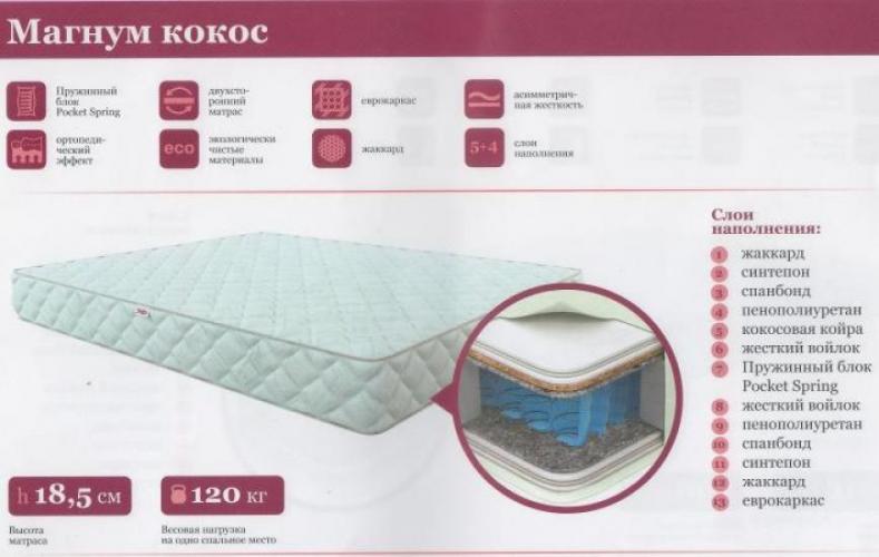 Матрас на основе пружинного блока Покет Спринг с разносторонней жёсткостью сторонобеспечивает комфорт как для любителей более жёсткой поверхности матраса, так и более мягкой. Экологически чистые наполнители гарантируют безвредность матраса для здоровья. Ассиметричная жёсткость сторон матраса за счёт использования в составе матраса кокосовой койры, делает модель Магнум Кокос подходящей для всех.