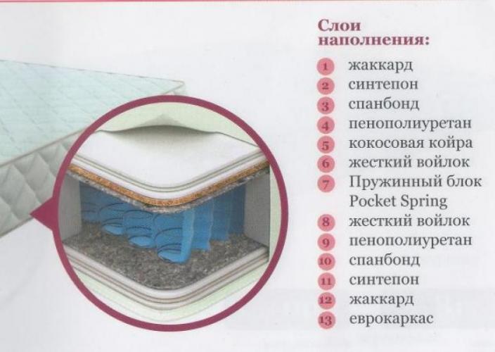 Пружинный блок Покет Спринг. Независимый блок пружин Pocket Spring поддерживает тело человека в анатомически правильном положении, обеспечивая ортопедический эффект. Специальная форма пружин, суженных к центру, предотвращает трение пружин друг об друга, продлевает срок эксплуатации матраса и исключает появление скрипа. Точечная поддержка тела человека обеспечивает правильное положение позвоночника во время сна и комфорт.