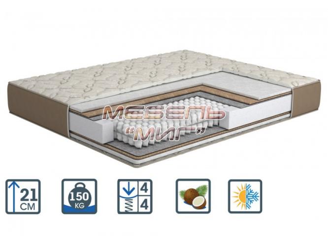 Тип матраса – двухсторонний Эффект Зима/Лето Жесткость: - 1 сторона – жесткая - 2 сторона – жесткая Высота – 21 см Еврокаркас Рекомендуемая нагрузка – до 150 кг на спальное место