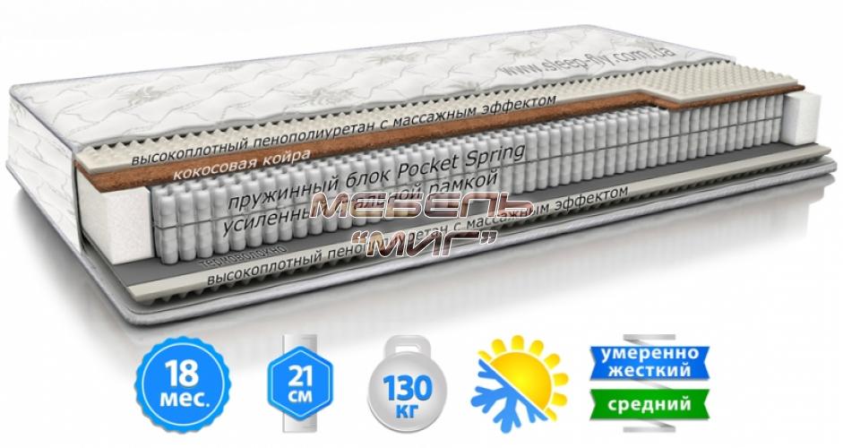 Производитель - Sleep&Fly; Чехол - Жаккард; Ширина - 70 см; Ширина - 80 см; Ширина - 90 см; Ширина - 120 см; Ширина - 140 см; Ширина - 150 см; Ширина - 160 см; Ширина - 180 см; Длина - 190 см; Длина - 200 см; Тип - Pocket Spring; Жесткость - средняя; Нагрузка на 1 место - 140 кг; Эффект "Зима-Лето" - Да